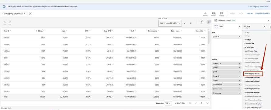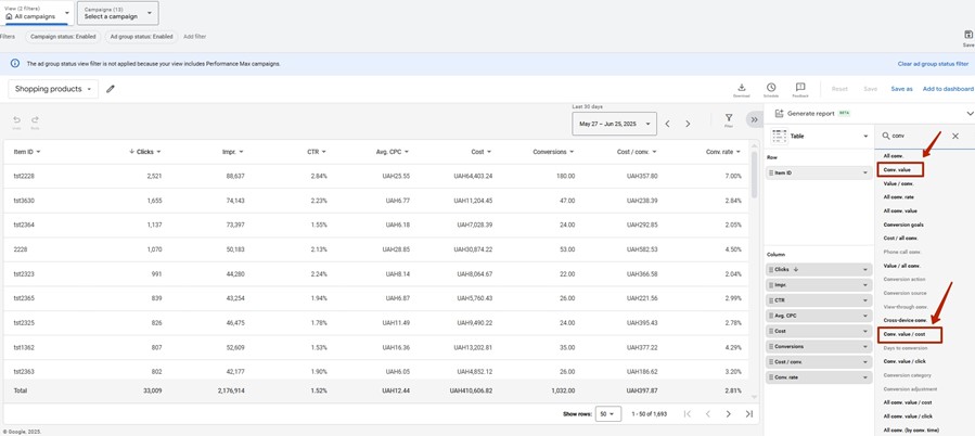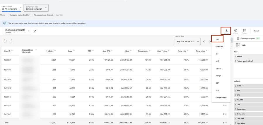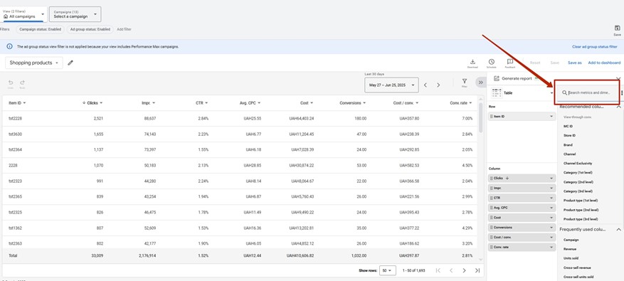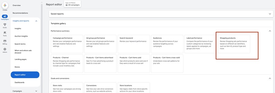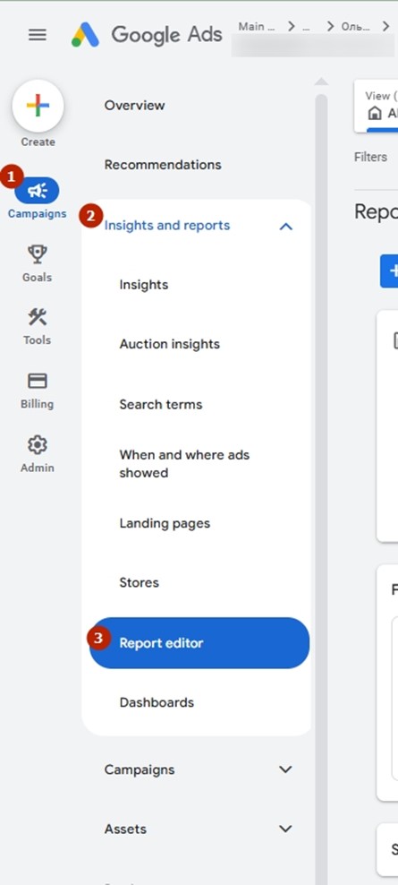 1. Enter the Google Ads account. Click on the section Campaigns – Insights and reports – Report editor