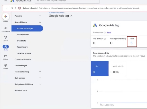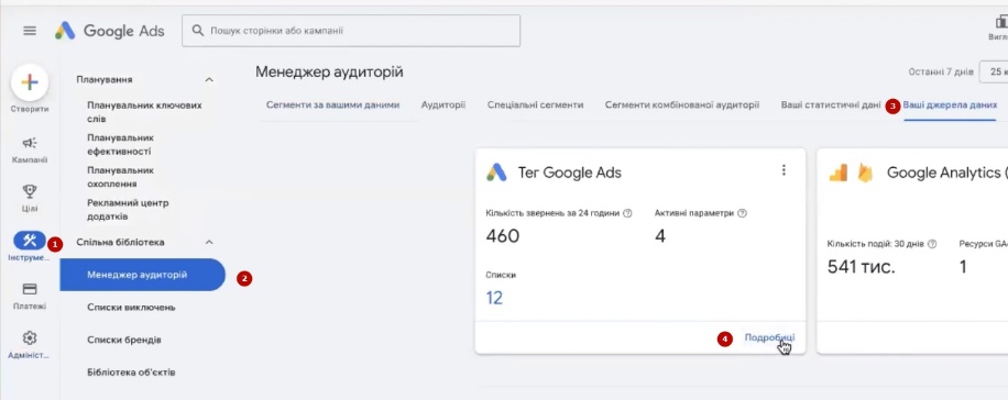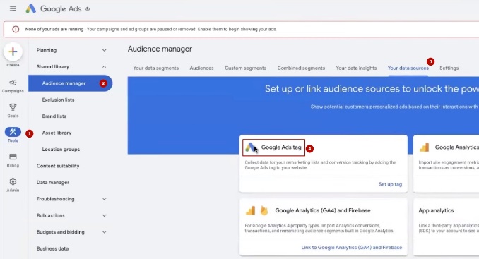 What you need to set up dynamic remarketing. Go back to your Google Ads account, go to Tools, go to Share Library, select Audience Manager. Then go to the “Your Data” block. Here there will be a block of various settings. What do we do? Find the Google Ads tag, click “Set up”.