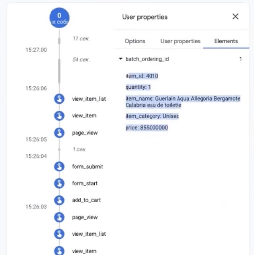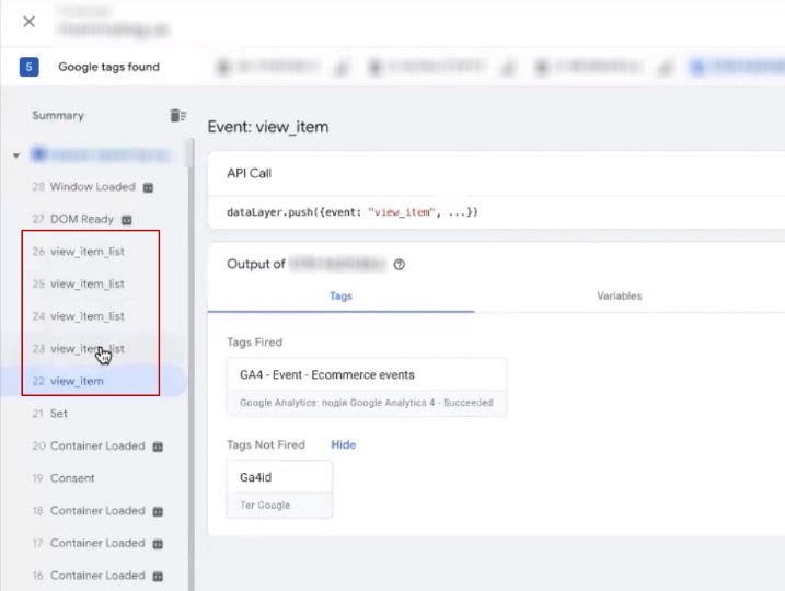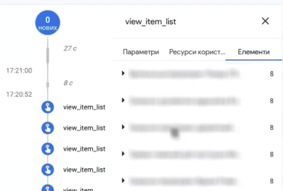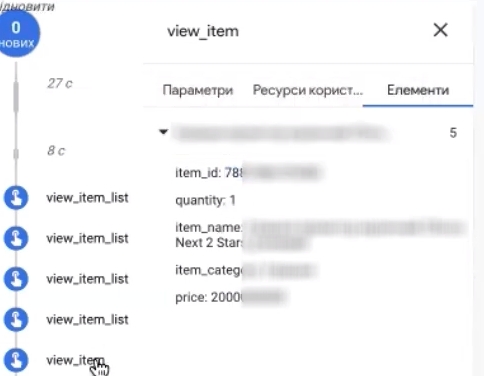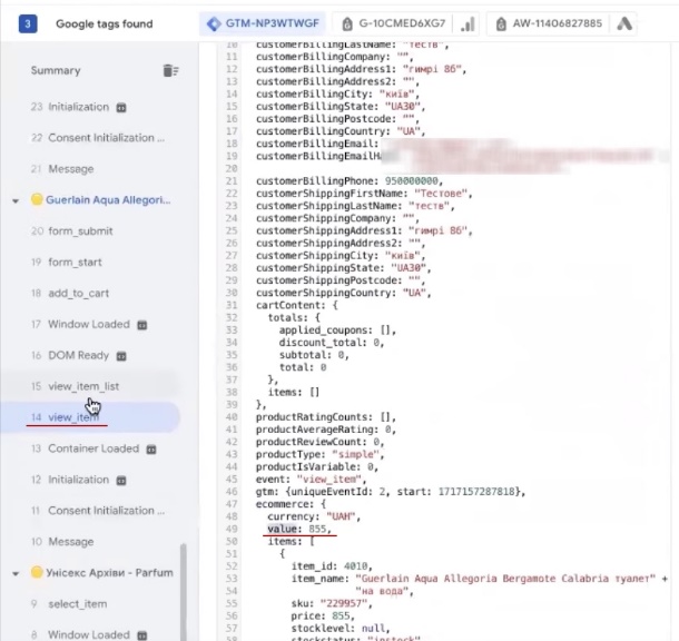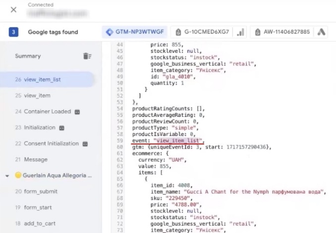 What do we do? Click View_item and check that there is Value, Currency, elements. Items, it is desirable to be completely similar to that viewed in the product card. Naturally, it is desirable to see if everything is correctly transferred as Item_ID. There is Quantity, so on and on it goes. These View_item_list, you see, they don’t have Value as a parameter anymore. See, I’m clicking, although Currency is there. And there are different goods in the elements.