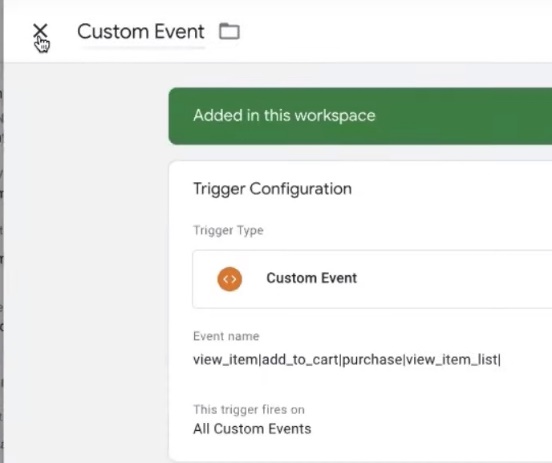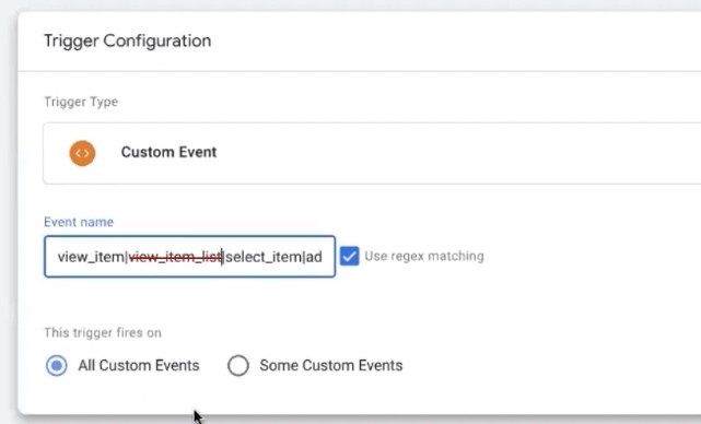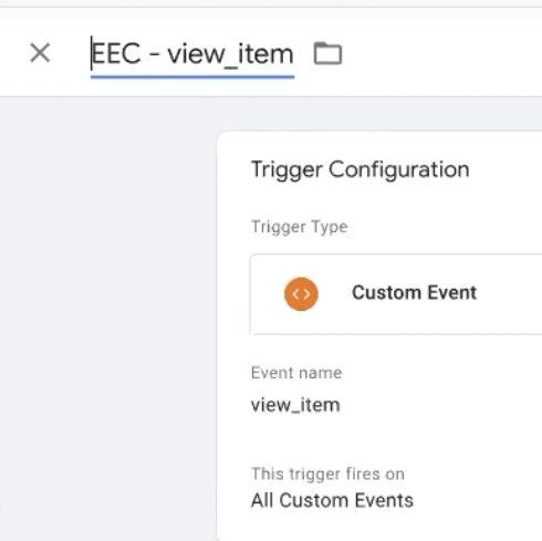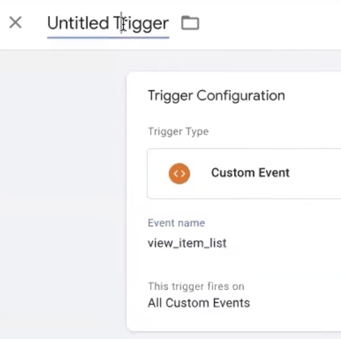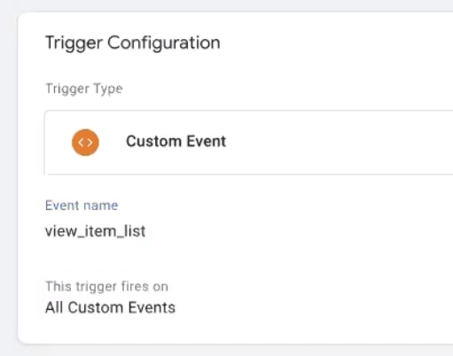 Let’s duplicate this tag for View_item_list. You only need one View_item_list, you don’t need a lot. We leave it all the same. Delete this thing. Go in. Click the “Trigger configuration” plus sign, scroll down. Select Custom Event, paste here our thing that we copied. Click “Save.”