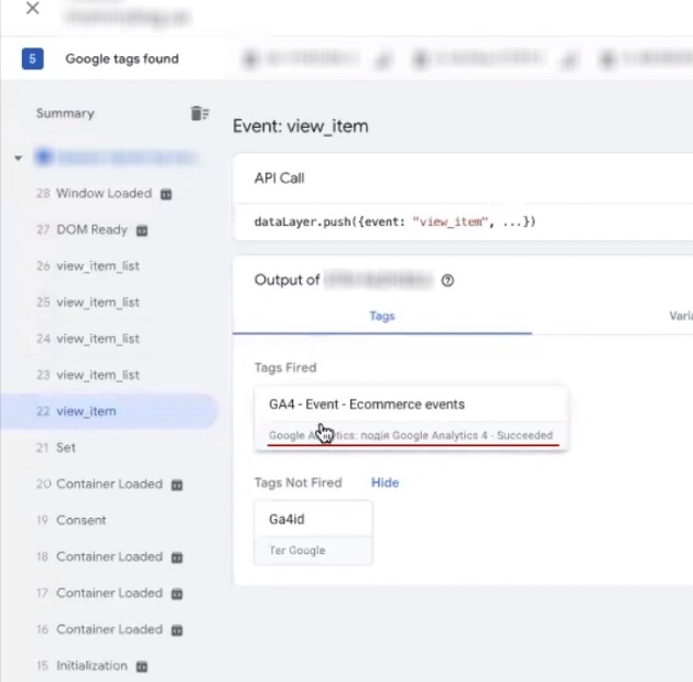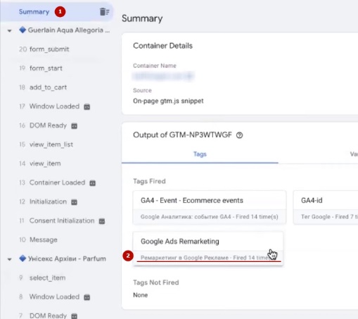 Now let’s check the whole set of events that we have. First, we click on Summary, we see that 14 times remarketing was triggered. We see that five times on View_item_list, there’s more, more…. Now we’ll fix the events.