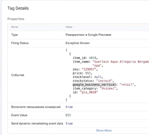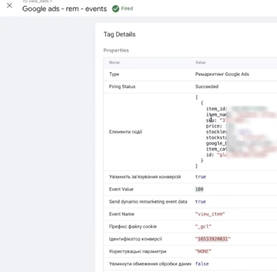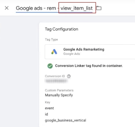 Next, it is mandatory that the view_item is passed. If we go in again there is an ID and google_bussines_vertical. Everything will fit Google Ads remarketing.