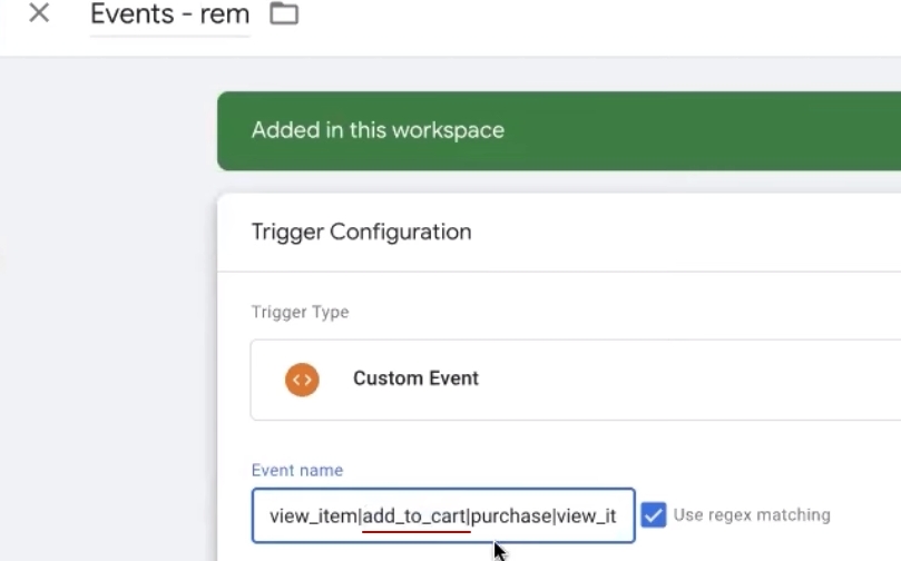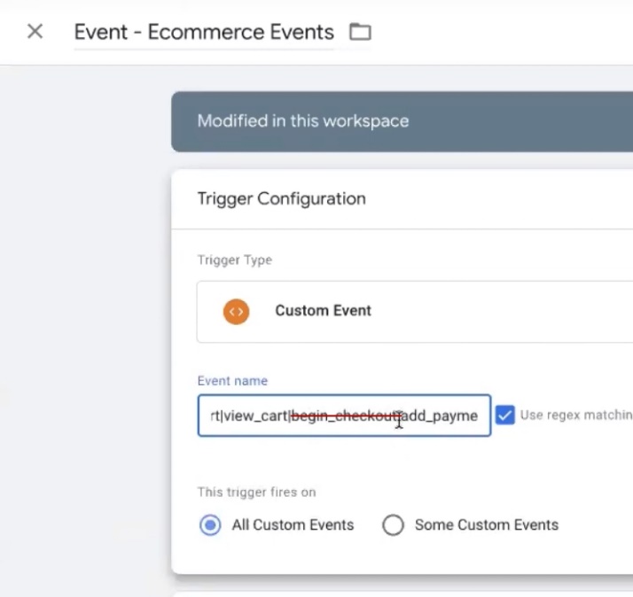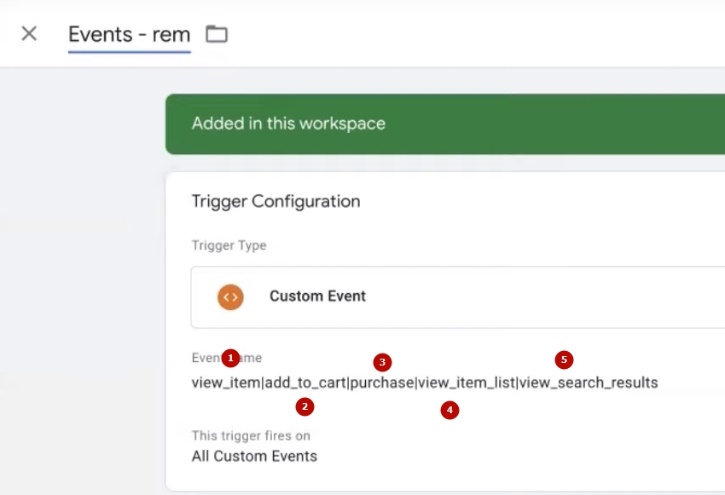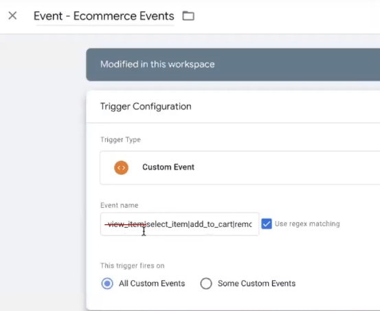 If we don’t redo everything, it will continue to be duplicated, for this we go to “Ecommerce Events”. “View_item”, “Purchase” is not here.