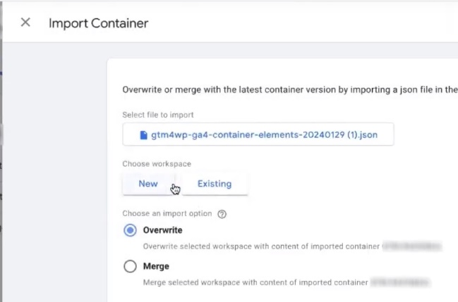 Select a new or existing workspace. Since the Tag Manager is completely empty, so we choose “Existing”. Our “Default workspace.” Next it offers to import, overwrite the whole container or merge. If you didn’t have Google Tag Manager before, you can freely leave “Overwrite” and that’s it. If there are some tags or something native, you can overwrite. You can rename conflicting some tags if there are duplicates or overwrite some things. I choose overwrite. As you can see, my container is completely empty, you can see it has created a bunch of stuff.