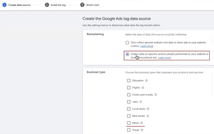 Choose “Collect people’s data on the base and show personalized ads”. Be sure to select Retail, after all, this is an online store.