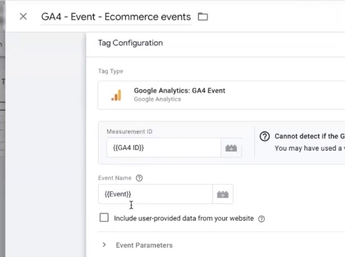 Need what? You need an Event. Need to pass the product ID. We need to set “google_bussines_vertical”, it will be the same. Now let’s set Event. We’ll take Event as a constant. And we’ll have to create an ID number, we’ll have to create a variable. “Ecommerce.items.0.id.” Now let’s do it, only there are all the Ecommerce events that we need.