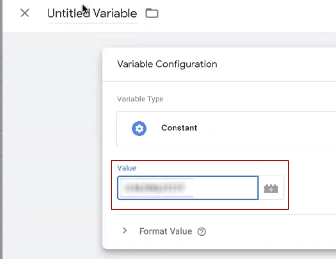 You have to fix this thing. You erase it, click on “Plus”, click on “Variable Configuration”. Look for such a block called “Constant”, insert the analytics identifier here.