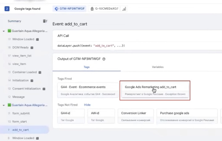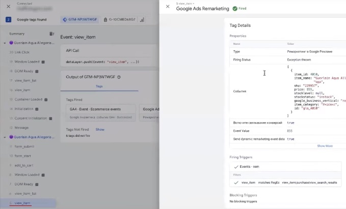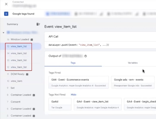 Double-checking the triggering of the tag. “View_item”. “View_item_list”, this thing triggers. It needs to be fixed now so that it doesn’t trigger several times. “To cart”, view_cart. One. The main thing is to have “add_to_cart”. “View_cart” is passed, as you remember. “View_item_list”. These mates are triggered since there is a “View_item”. We’ll have to redesign the Trigger.