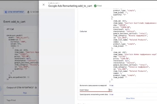 Okay, one more time. There’s just some Google Tag Managers. Now, just a second. Publish. Hit Preview. There’s been an unexpected glitch. We’ll double-check it. It looks like the last time it didn’t save the changes. It kicked out and that’s why it crashed. I log out of my WordPress, click Preview, look for the product card. Found it. Our product card. There is a View_item, you see 1, 2, 3, 4-some View_item_list is there. It depends on the template. The information is duplicated. We just use one view_item_list.