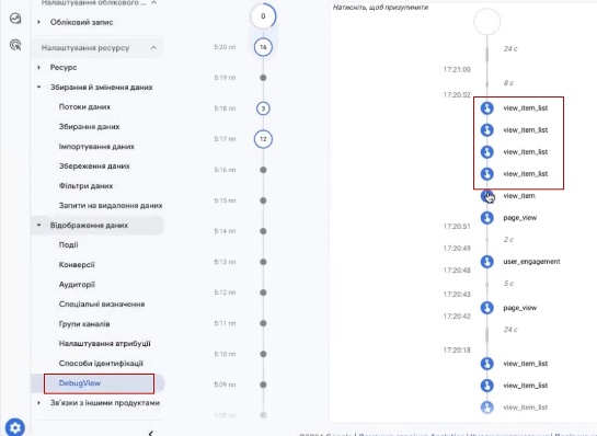 Naturally, with this setup, we won’t see much stuffing here. What do we do? Go back to our analytics, go to “Data Display”, the block called “DebugView” and wait for these events to drop down. They can fall right away, they can be 1-2 minutes late.