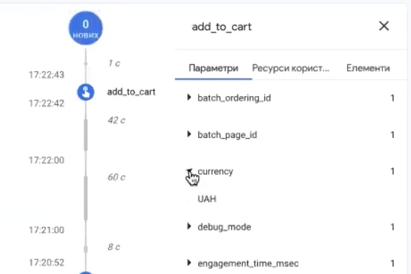 Next. Be sure to click “Buy”. It is important that add_to_cart appears. It’s there. I’m looking at the same thing in the fourth analytics, closing that thing. I’m waiting for add_to_cart to appear, because it automatically drops here. See, a little late. Make sure you have Value, Currency, items. The item that you added. It is desirable to do the same story with several items.