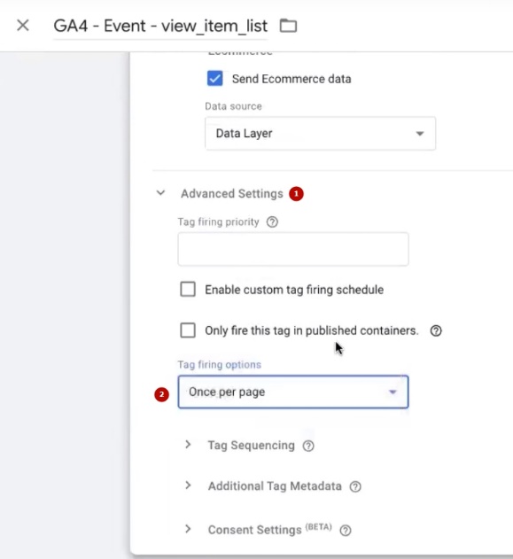 Then with a similar emphasis, be sure to check the tags on View_item. One position. Great! View_item_list, you can pass more if you want. View_item_list, so that it triggers once. View_item again. We’ll do View_item_list separately. What do I see? It’s not working. To make everything beautiful, perfect. Copy. It is obligatory to “view item list”. It is obligatory to select “Once per event”. Here we must select “View_item_list”.