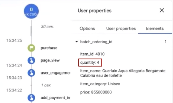 Ecommerce Items, just one item. Let’s see what’s in the analytics. We bought one item, four of them. I beg your pardon. That’s right – four pieces, just one item. Everything worked correctly. Just what?