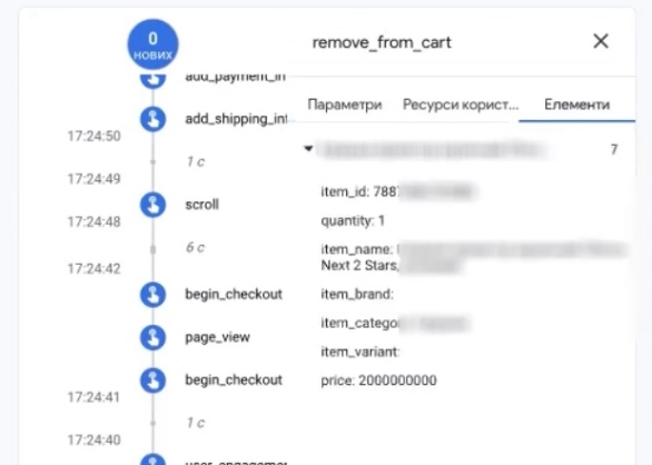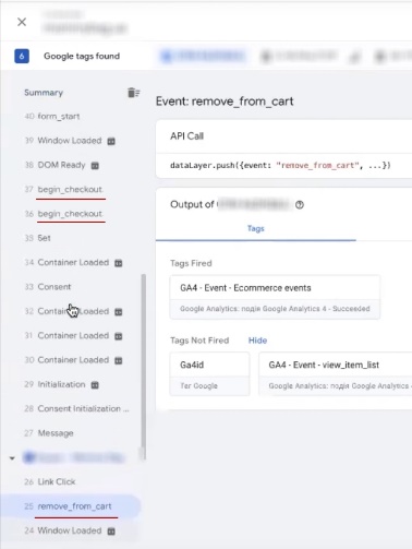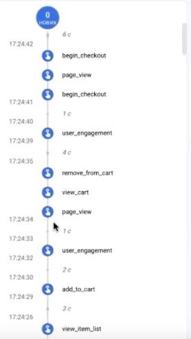 Next is obligatory, look, it is desirable to see what? Remember, here further view_cart, this is the cart. There is Remove_from_cart (removing it from the cart). There are several Begin_checkout. You can see they are duplicated, so we’ll have to make them the same as Add_shipping_info. Shipping info is not duplicated. Begin_checkout is duplicated and Purchase.