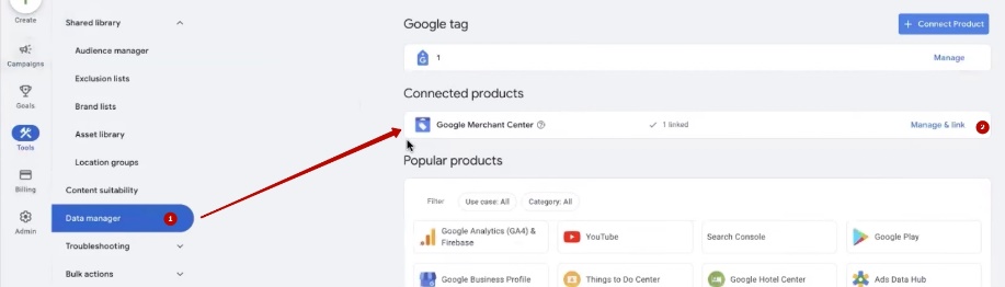 What do I need to link Merchant Center? You need to go to the Data manager Merchant Center Google Ads.