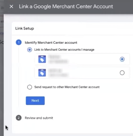 It’s mandatory here, if there’s a bind, if there’s a request coming in. The wrong Merchant Center is linked. It’s unlinked. We press the plus sign and choose the right one. It’s “Parfum.” “Submit.”