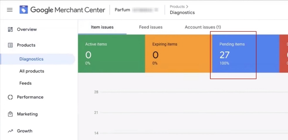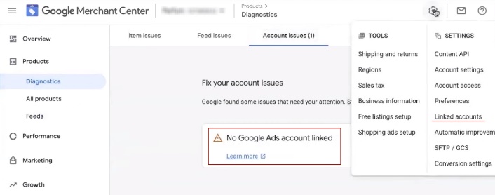 Going back to Merchant Center, possible ad campaign in another source, right? I’m going into diagnostics. It says that Google ads account is not connected. I’m looking for “Linked accounts”.