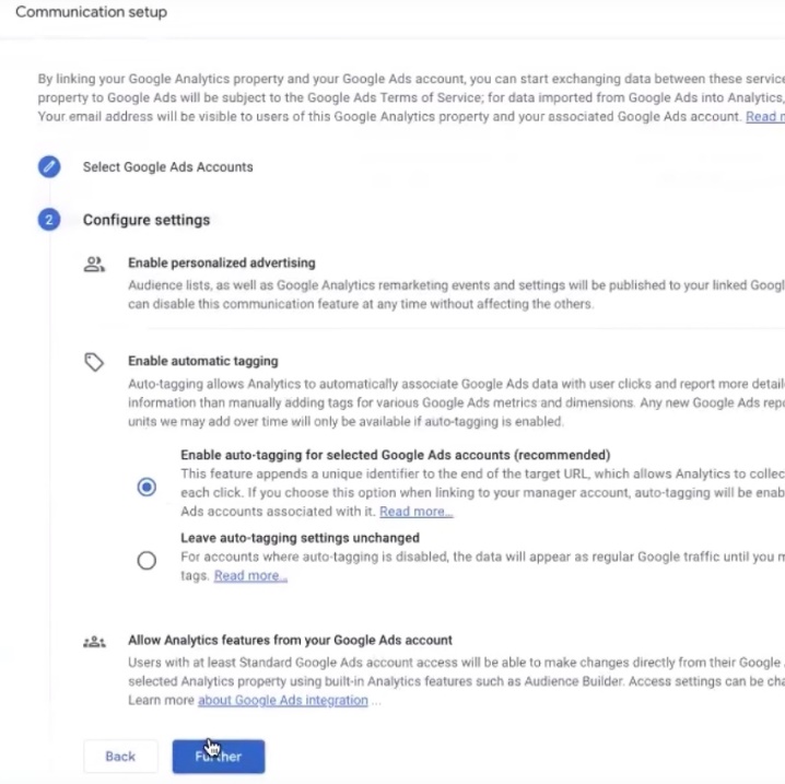 This is where I choose Google Ads. It’s the only one. This is if you don’t have Google Ads, check that in administrative accesses there are mail in Merchant Center, in Google Ads and in analytics. Confirm everything further. “Enable auto-tagging” is fine. “Further”. “Save.” You can redo this later.