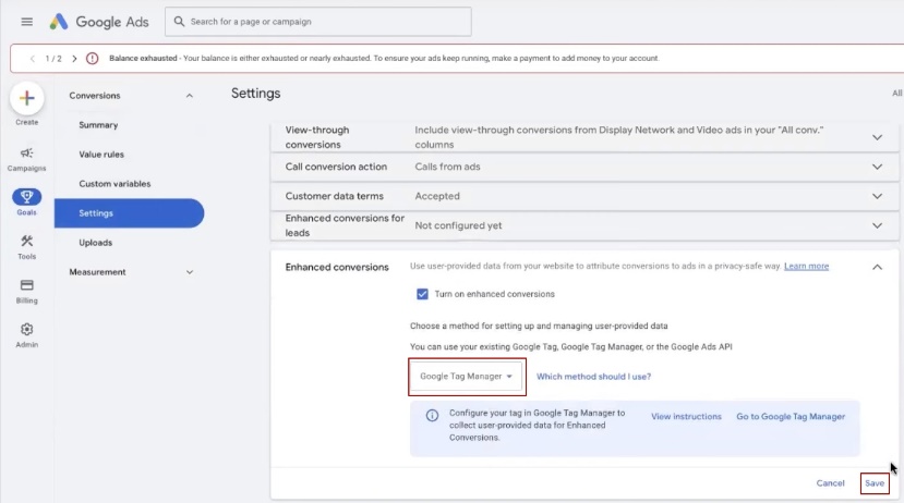 Another setting that remains for conversions is to go to Conversions, in Settings. Since Google Tag Manager was used to set up the transfer of all conversions here, select Google Tag Manager. Save.