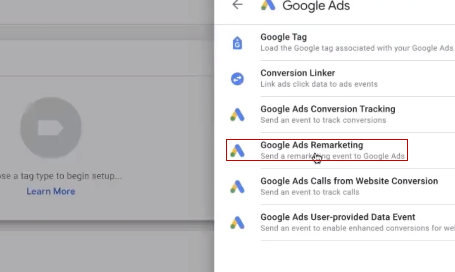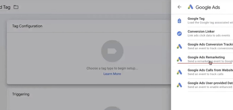 Not a super complicated story either. Let’s go back to Google Tag Manager. Click “New”, select “Tag Configuration”, select Google Ads, select “Google Ads remarketing”.