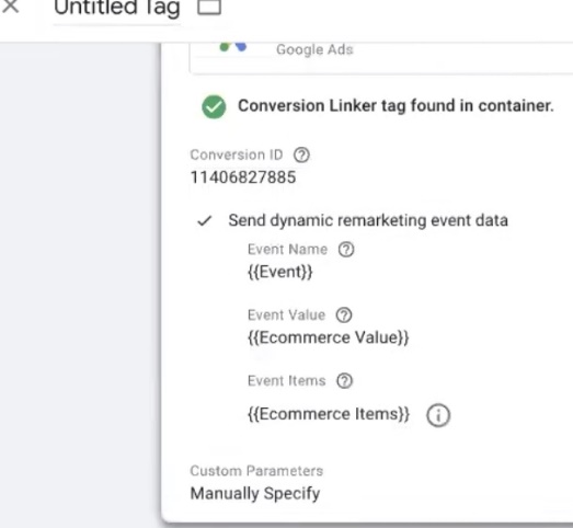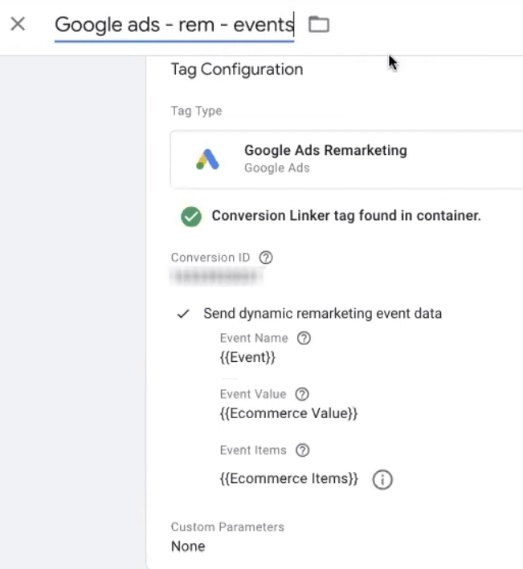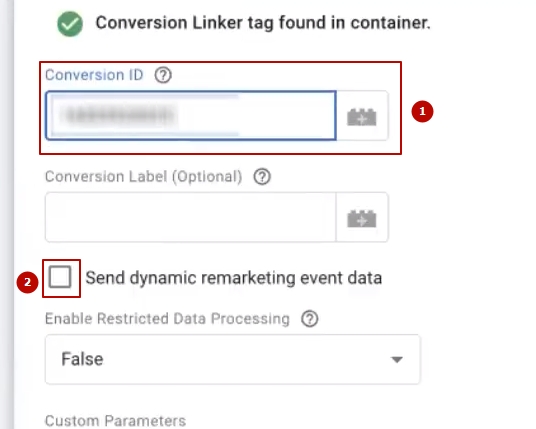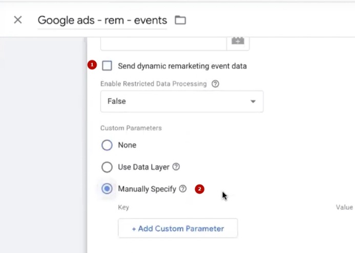 What do we do? We redo the tag. Remove “Send dynamic remarketing event data”. We’ll set the parameters manually.