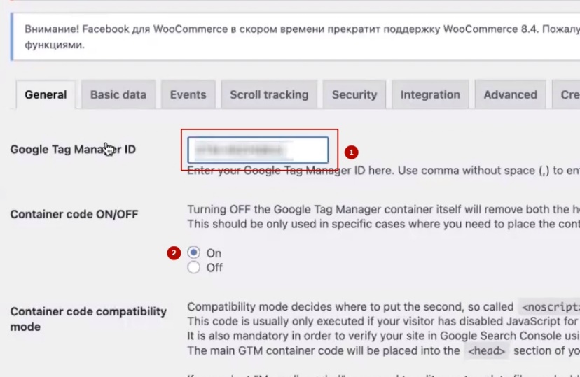 Next, we go back to the plugin. It is opened Google Tag Manager for WordPress options. In the General, in the block, be sure to insert the Google Tag Manager ID. Next, be sure to turn Container code On/Off to “On” to make it work.