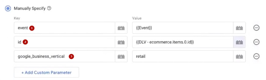 Passed ID, “event”, “google_bussines_vertical”. That’s the basic information you need. You can add what you want Value, stuff like that. It’s a fundamental thing for Google.