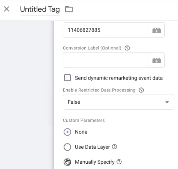 Here we insert Conversion ID from the previous step. Label is no longer needed. We can choose the settings: choose dynamic, so that everything is taken from the data level or set manually (Manual).
