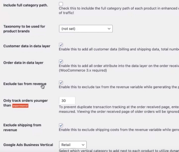 The next block of settings is for Google Ads dynamic remarketing. Make sure to set Google Ads Business Vertical to “Retail” if you have an online store. Everything else is for education, flights, hotels, for other activities. We’ll keep retail.