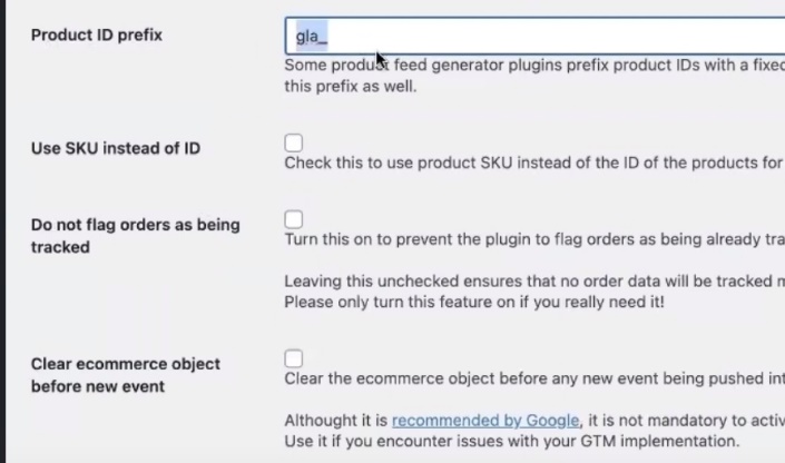 There is also a thing called gla_ in the “Product ID prefix”. Let me explain why it is set. I upload WooCommerce feeds with a free plugin called Google Listings & Ads. This plugin makes an ID like this.