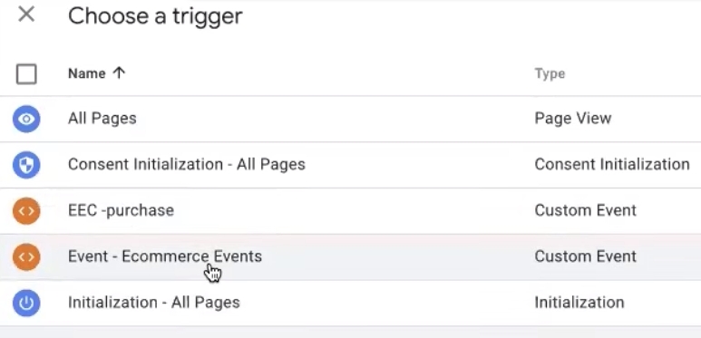 Choosing triggers. Triggers can be selected in different ways. You can select all the events that you have. If you go over here and look at them, there’s a huge set of different data.