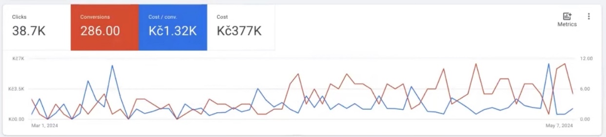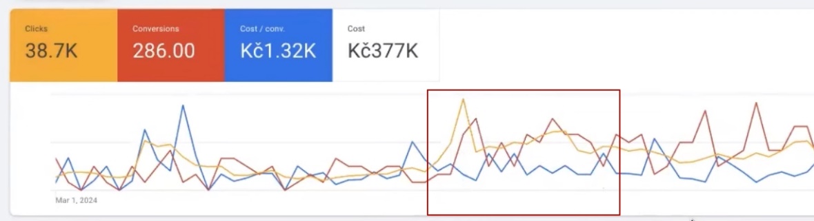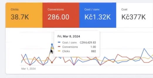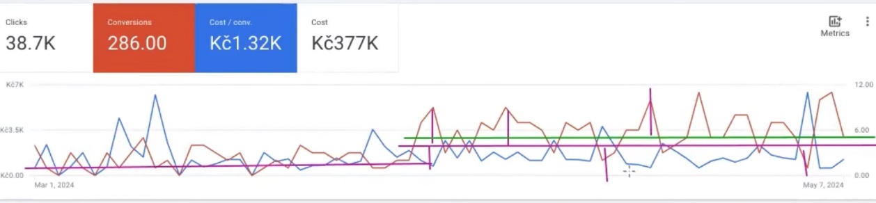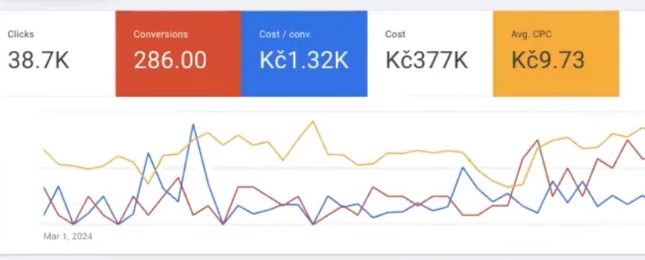 Here we add our metric as cost per click, where it is avg. CPC. Look, it’s 9, almost 10 Czech crowns. Just a minute, at least four times. They spent at least an average of 40 crowns just to convert it. This is average. There is more or less. The performance adaptively tries to adapt to the guys who are buying.