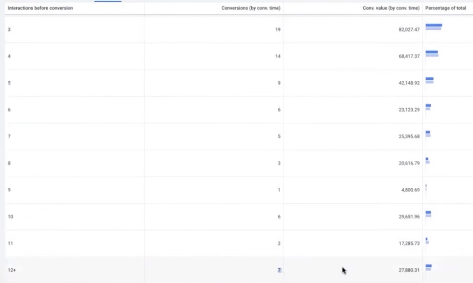 What do we see? We see the most critical thing – what affects the cost of the conversion price. Average number of interactions before conversion. It’s 4.1. Just imagine, this Italian clicked an average of four times before making a purchase. Of course there are smaller numbers. Eat more. This amount was earned, relatively speaking, by people who took 12 interactions. Our advertisement was clicked 12 times.