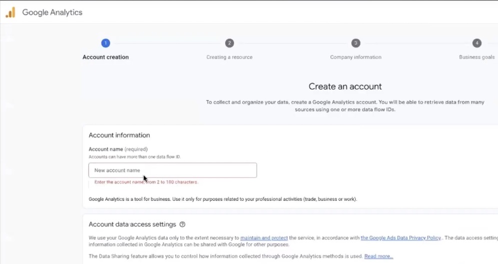 How do we start the process of setting up all analytics and conversions? Let’s start by creating a fourth analytics account. You need to go to analytics.google.com. Of course, log in with your Gmail account. Click “Create an account”. Next, you need to name it.