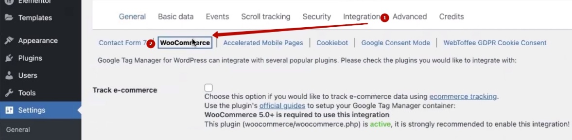 Next, we go to the “Integration” section, go to the “WooCommerce” block, and check several important boxes. The first one is that everything we do should be tracked by e-commerce.