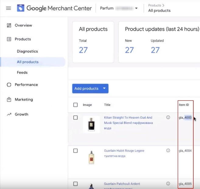 “Product ID prefix”. To understand whether it is necessary to put it, you need to return to the Merchant Center, go to “Products”, go to “All products” and look at the ID tag.