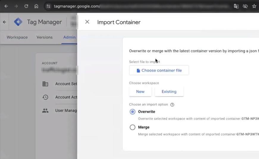 There are two options that Google Tag Manager offers next: load a container with content, because it will save a lot of time, into a new workspace or an existing one. I have a completely empty container, so I choose “Existing”. Then it will offer to overwrite it all or merge it. It’s completely empty. I’ll select “Overwrite”. If you previously had a Google Tag Manager and had something set up in it, select Merge.