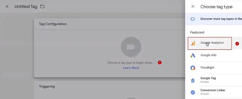 Click “Create Tag”, select Google Analytics, select Google Tag, return to our analytics, go to Data Flow ID, copy it.