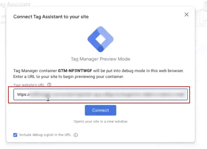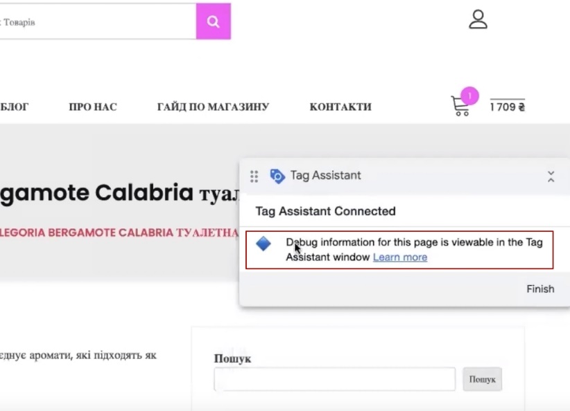 This is the window with the block “Debug information for this page is viewable in the Tag Assistant window”.