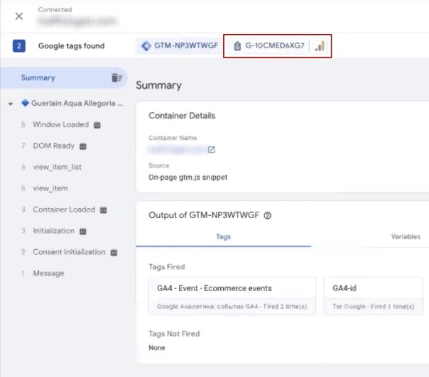 After the Tag Manager, at least two windows open. You see, this is a kind of debugger where we can see our codes. You see, the fourth analytics says that it has already been delivered through Google Tag Manager.