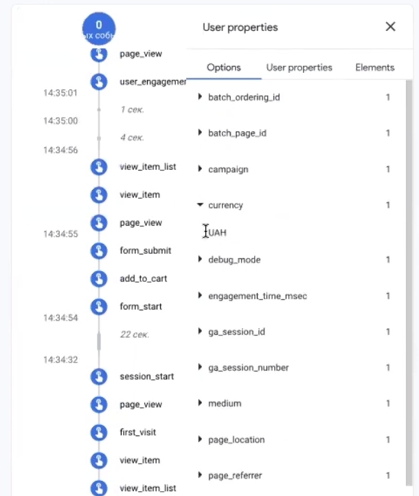 At first, it may quickly display information like this. It can be delayed for a few minutes, but it usually is. Scroll to the very bottom and see view_item. Let’s open it. What’s in it? Currency must be transmitted, it is important. Value (price of the product), it must match what was on the website. All other parameters can be larger or smaller as desired.