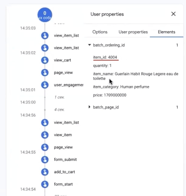 What are these things? View_item is an event that will indicate in analytics that a person has viewed a product card. View_item_list – the fact that a listing was viewed. What listing was viewed on the product card? Usually, some similar ones or some users’ choices, different lists are pulled up. Everything belongs to the listings. Listings include the transition to a category. A bunch of products and this can be considered a listing. Let’s return here. Next, add_to_cart is the event of adding to cart. The rest is the same story – there is a cart view, checkout start, payment info, shipping info, purchase. This is now automatically included in our analytics.