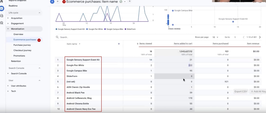 What can we see? The coolest reports – we can see how many products were viewed by view_item. We looked at it. Then these view_items were added to the cart a total of how many times. See, test data. They may or may not be logical. Not critical. And purchased goods.