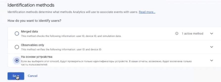 What do I need to fix in my Google Analytics profile? At the moment, after the video, if you want, you can look at this information in your analytics demo account. I recommend that you click “show all” in the identification methods here and select “Device-based”, the last block. “Confirm.” This will record the data in a slightly different way.