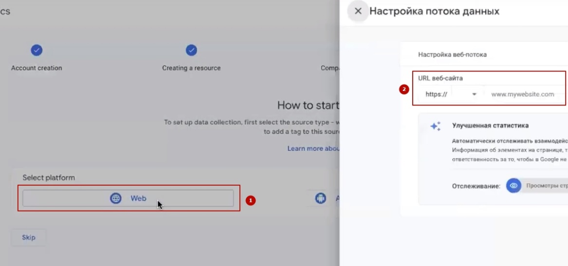 Click on “Web”. Next, paste the website. Of course, it must be on https, not http. The name of the domain is also important. All checkboxes are enabled, click “Create account”. Now the system will definitely offer to set up our analytics. But we’ll get to that later.