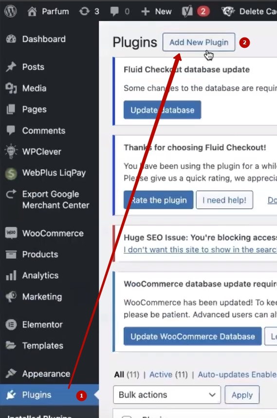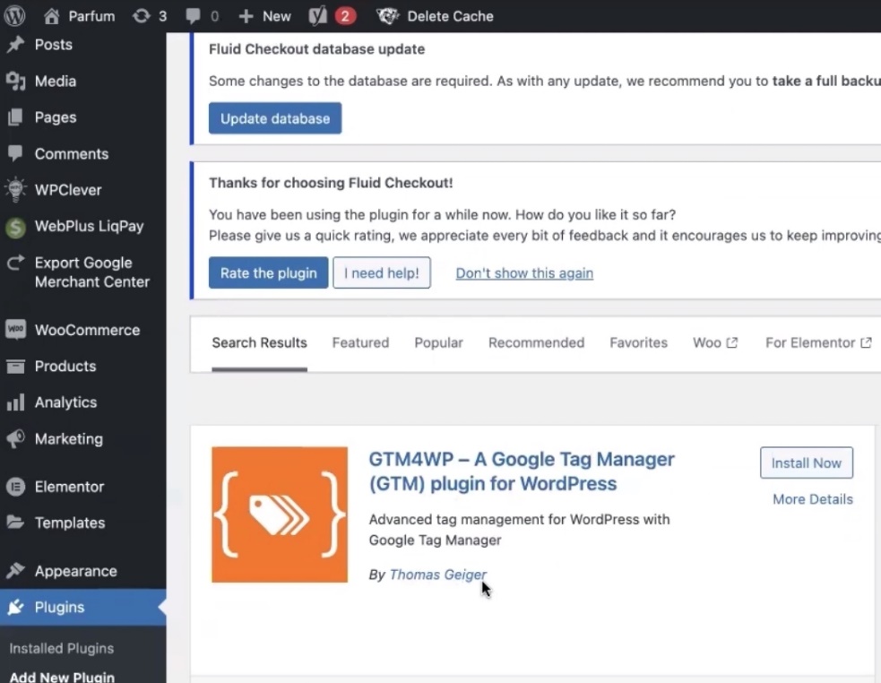 We need to install Google Tag Manager on WordPress WooCommerce, through which we implement what we need for analytics. Go to “Plugins”. Click “Add New Plugin”. Then I suggest entering the following characters in the search bar “gtm4wp”. The first plugin called A Google Tag Manager (GTM) plugin for WordPress will appear here and will be signed by Thomas Geiger. Let’s install it. Let me remind you that we’re going to set it up from zero to the end. To the maximum. We’re stuffing Google with all the information we can, cheaply and angrily. We will use the advanced settings. Be sure to click “Activate”. Once activated, we go to the plugins and now look for this plugin.