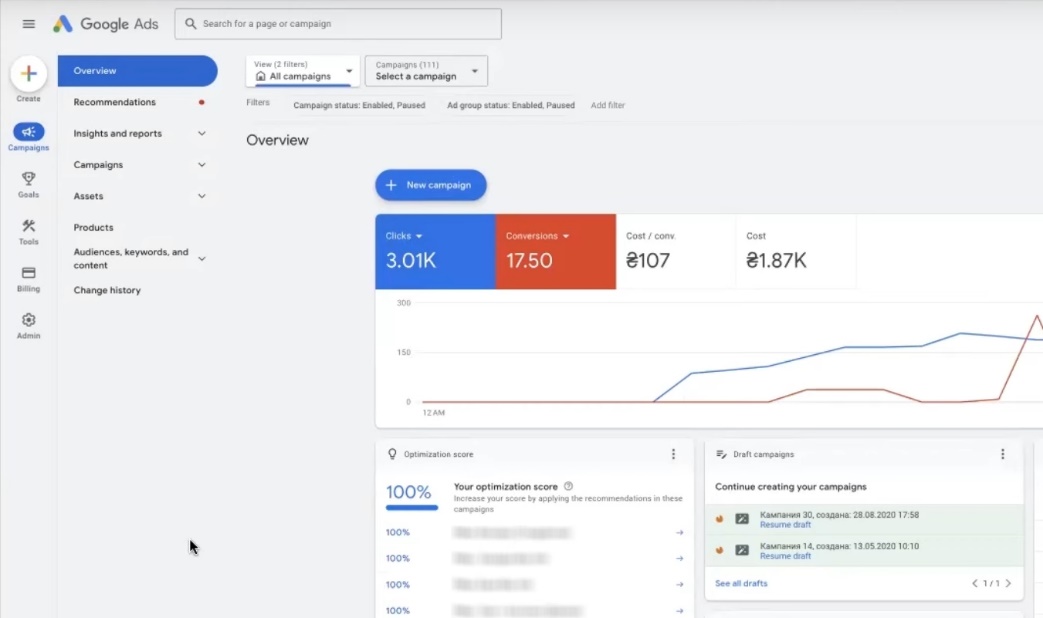 Что для этого нужно сделать? Приблизительно, если вы заходите в свой рекламный аккаунт, вы будете видеть такую картинку – это новый интерфейс. А в темном интерфейсе, который еще черно-серый такой, там будет сверху у вас панель навигации. Она вот здесь, перемещенная прямо в левую сторону. Что нам нужно сделать?