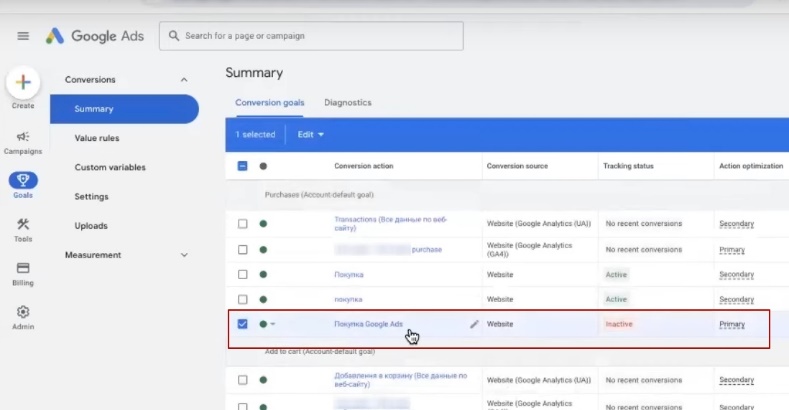 И вот она у нас есть вот эта покупочка Google Ads. Она написана как неактивная.