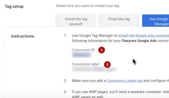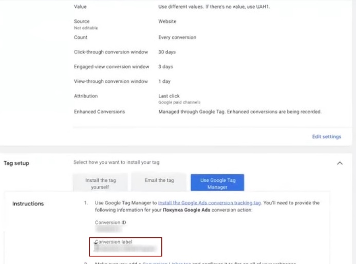 Заходим в эту конверсию. Мы же донастраиваем эту конверсию. Мы раскрываем этот блок настройки. Выбираем наш таг менеджер и видите, здесь есть метка этой конверсии. У меня называется это Conversion label. Вот я копирую эту всю штучку себе.