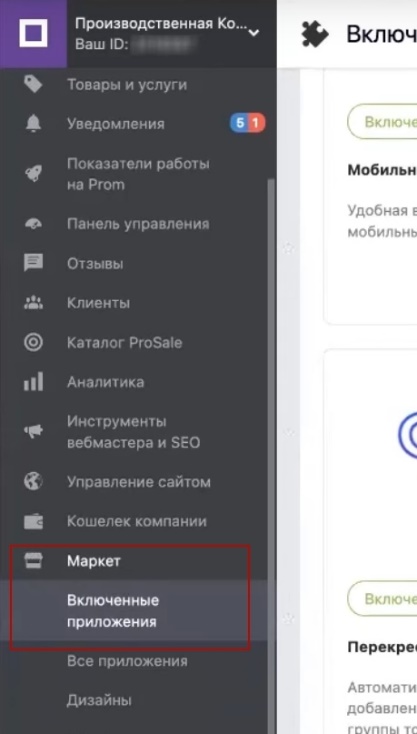 Вот мой кабинет Прома. В этом блоке вы пролистываете в «Маркет» «Включенные приложения» и здесь находите «Google Ads».
